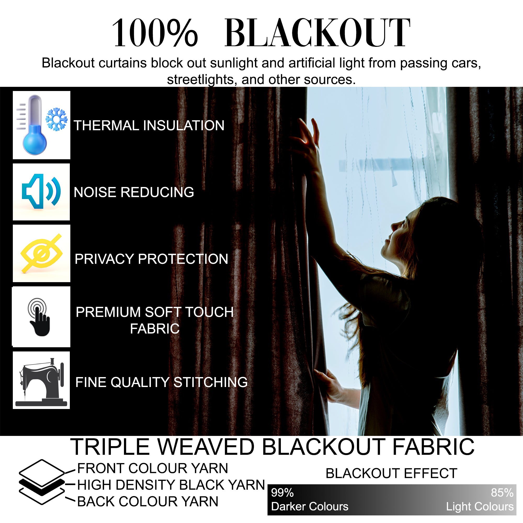 Blackout Fabric: Crafted from premium blackout fabric that effectively blocks out sunlight and reduces outside noise for a peaceful indoor environment.